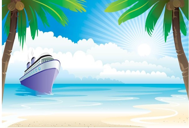 EPS格式,含JPG预览图,关键字:矢量风景,大海,轮船,太阳,云朵,放射线,阳光,沙滩,椰子树,矢量图