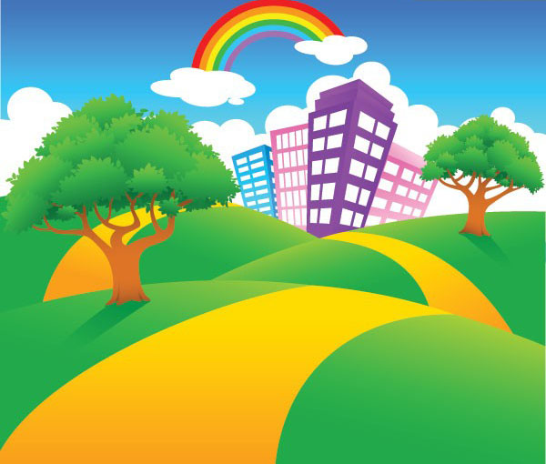 EPS格式,含JPG预览图,关键字:矢量风景,卡通,马路,树木,草地,蓝天,白云,彩虹,建筑物,高楼大厦,色彩缤纷,矢量图
