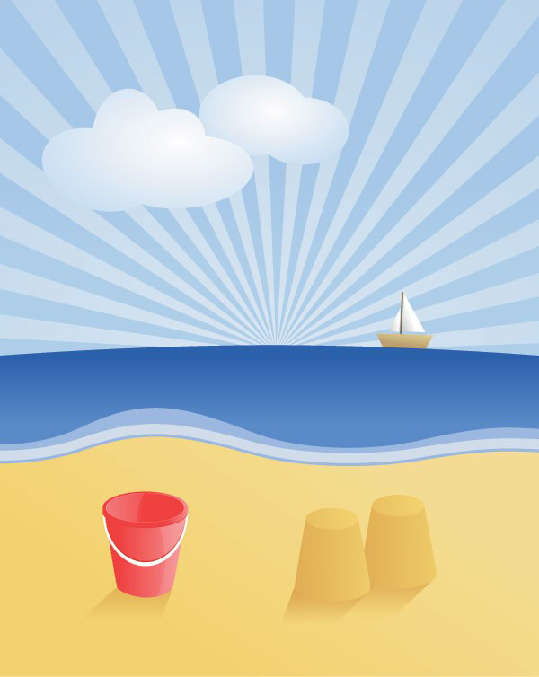 EPS格式,含JPG预览图,关键字:风景矢量素材,大海,海滩,小船,天空,云朵,小桶,放射线背景,矢量图