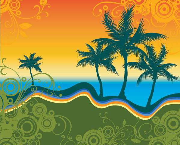 EPS格式,含JPG预览图,关键字:矢量风景,椰子树,海边,大海,剪影,潮流花纹,动感彩色线条,矢量图... │彭志勇