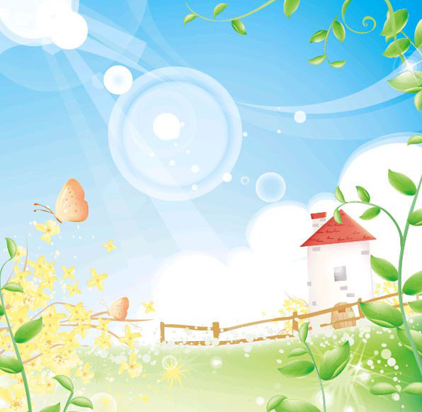 AI格式,含JPG预览图,关键字:矢量风景,藤蔓植物,绿色,草地,花卉,夏天,蝴蝶,房子,篱笆,蓝天,梦幻,风光,矢量图