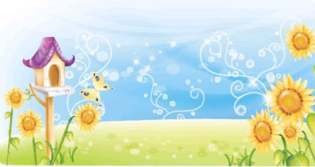 AI格式,含JPG预览图,关键字:矢量风景,向日葵,花卉,草地,蝴蝶,矢量花纹,鸟房,风光,矢量图