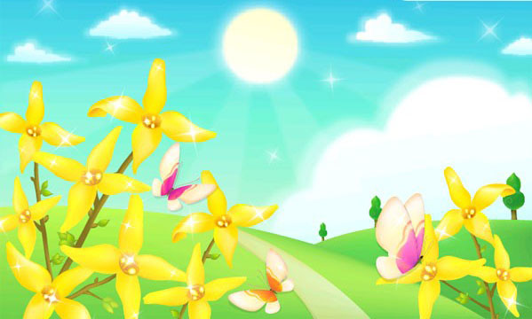 AI格式,含JPG预览图,关键字:矢量风景,花卉,蝴蝶,郊外,风光,草地,树木,小路,太阳,白云,矢量图