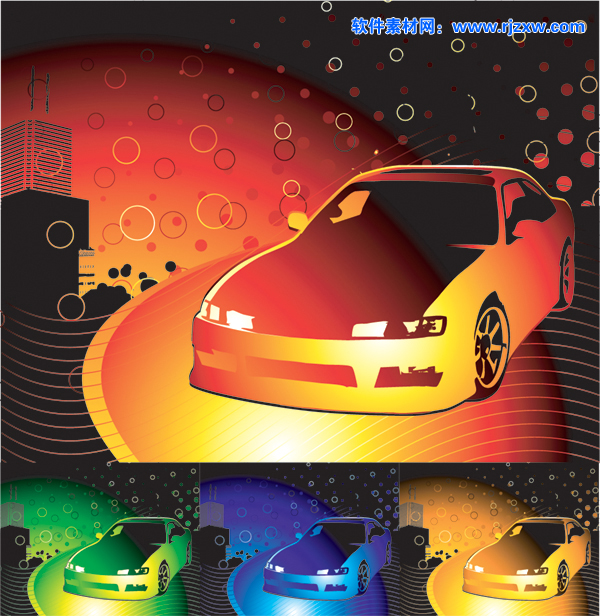 EPS格式,含JPG预览图,关键字:矢量汽车,小汽车,跑车,蓝色,炫目,时尚背景,建筑剪影,圆圈,矢量图