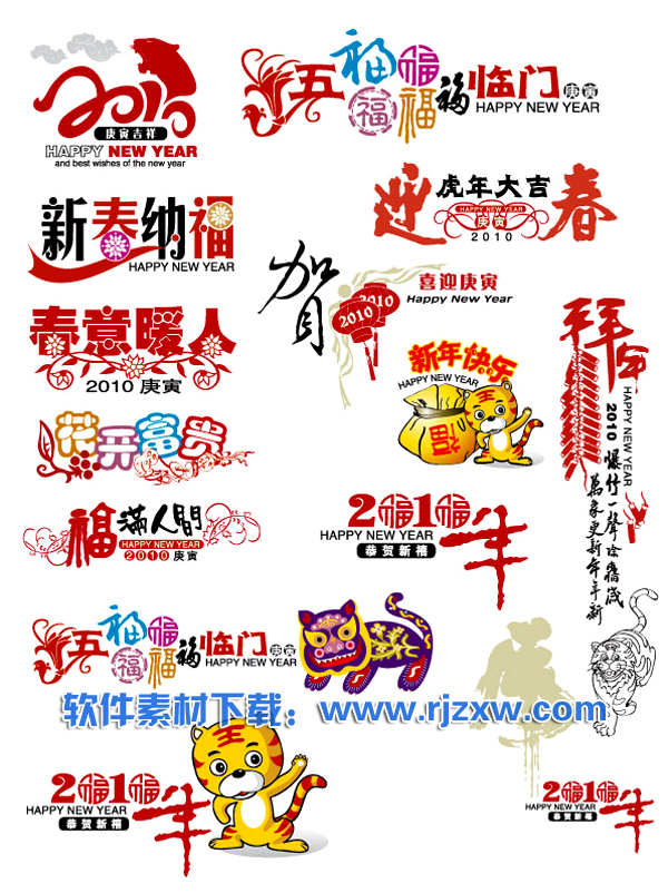 EPS格式,含JPG预览图,关键字:矢量字体,艺术字,虎年,2010年,新春纳福,春意暖人,花开富贵,福满,矢量图