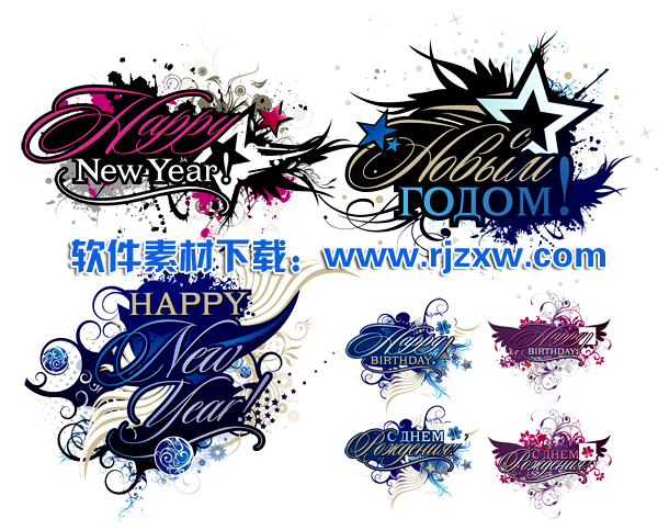 EPS格式,含JPG预览图,关键字:矢量字体,潮流,生日快乐,happy birthday,五角星,潮流花纹,翅膀,矢量图