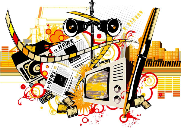 EPS格式,含JPG预览图,关键字:矢量潮流,潮流插画,新闻主题,喇叭,播放器,报纸,文字,电视机,钢笔,矢量图