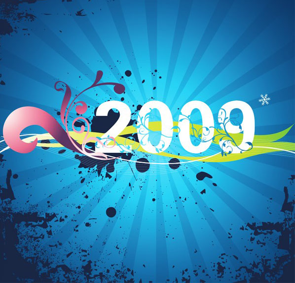 AI格式,含JPG预览图,关键字:2009,矢量花纹,喷溅效果,墨点,新年,光芒,雪花,律动的线。