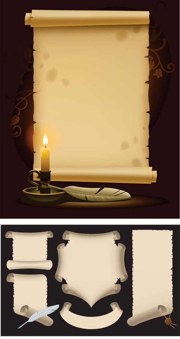 实用的卷纸效果和羽毛笔矢量图