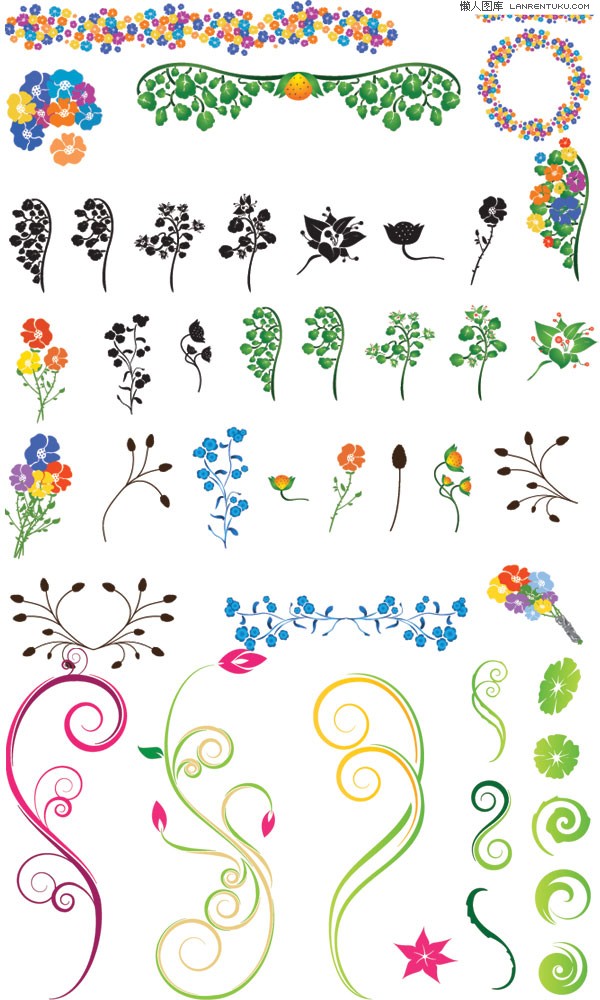 彩色与黑白植物元素花边花纹矢量图素材下载