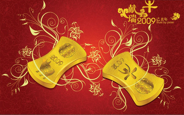 AI格式,含JPG预览图,关键字:金牛献瑞,已丑年,新年,2009,吉祥图案,牛,金条,花纹,红色,中国传统,春节,中国风,矢量素材