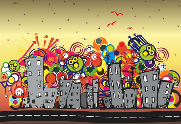 有趣卡通城市建筑插画矢量图由软件自学网免费提供下载。