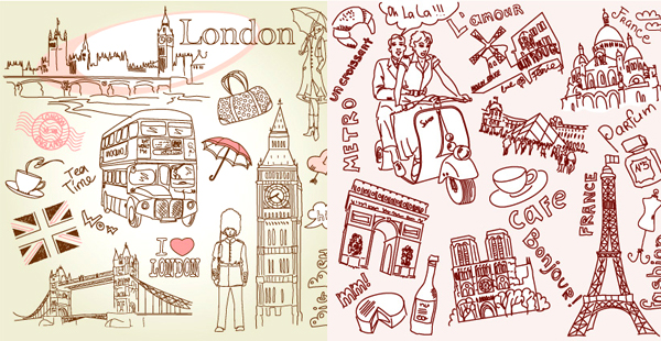 线条涂鸦巴黎和伦敦名胜古迹矢量图由软件自学网免费提供下载。