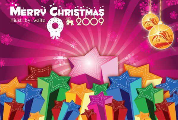 AI格式,含JPG预览图,关键字:圣诞矢量素材,立体五角星,螺旋花纹,圣诞挂饰,2009圣诞素材,五颜六色的星星,圣诞雪花,Merry Christmas,矢量素材