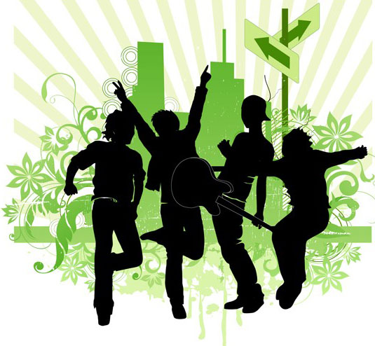 EPS格式,含JPG预览图,关键字:摇滚,绿色花纹,花纹背景,剪影,舞蹈,吉他,高楼,箭头,圆圈,光芒,矢量素材