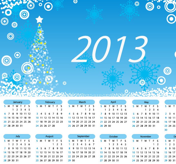 EPS格式,含JPG预览图,关键字:雪花,星星,冬季,圣诞树,冰晶,蓝色,圆圈,光点,2013日历,年历,矢量图