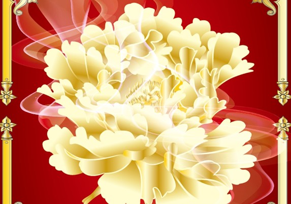 AI格式,含JPG预览图,关键字:矢量花纹,花朵,牡丹,金色,华丽,精致,工笔画,花瓣,花蕊,边框,烟雾,矢量图