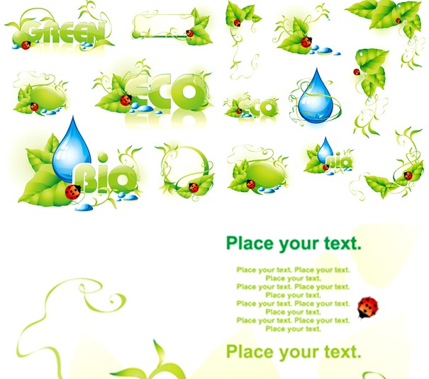 EPS格式,含JPG预览图,关键字:矢量边框,装饰边框,绿叶,植物,瓢虫,水滴,露水,藤蔓植物,BIO,ECO,,矢量图.