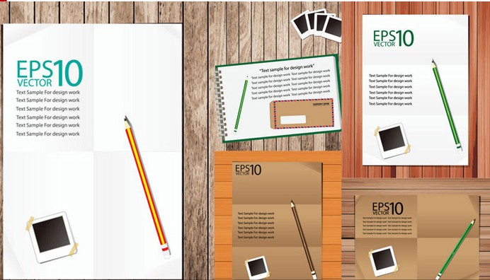EPS格式,含JPG预览图,关键字:木纹,笔记本,记事本,木板,铅笔,英文,信封,照片,矢量图