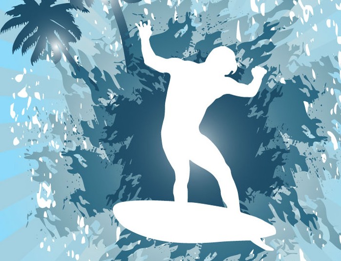 AI格式,含JPG预览图,关键字:夏日,椰树,冲浪,人物,剪影,运动,大海,光晕,矢量图
