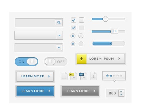 PSD格式,含JPG预览图,关键字:搜索,按钮,滑块,下载,下拉菜单,星星,评级,单选按钮
