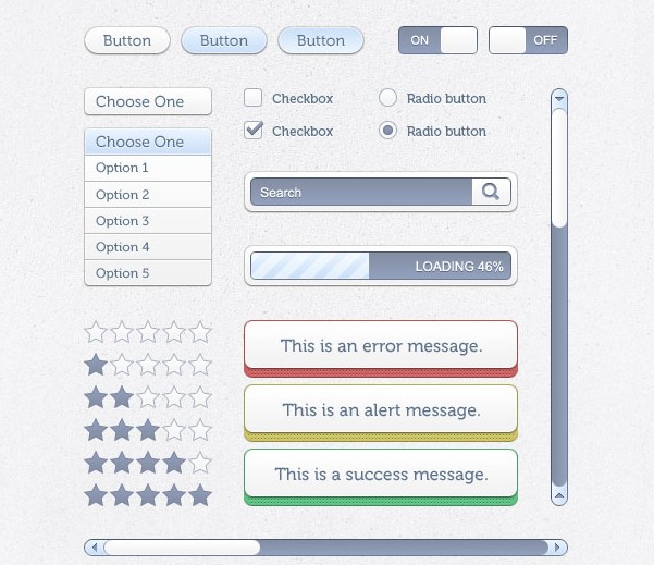 PSD格式,含JPG预览图,关键字:按钮,搜索框,滚动条,复选按钮,单选按钮,星星评级,loading,下拉菜