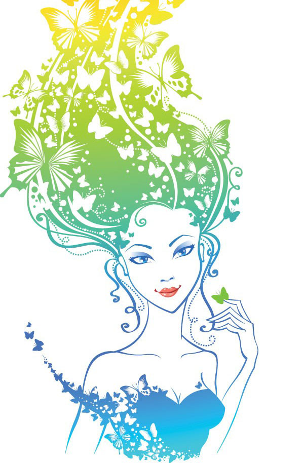 EPS格式,含JPG预览图,关键字:矢量人物,女孩,矢量蝴蝶,潮流元素,时尚人物,头发,色彩缤纷。