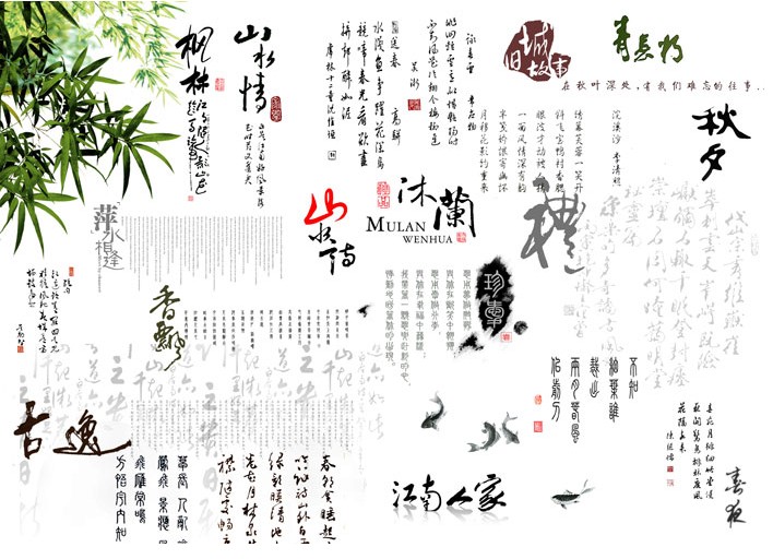 PSD格式,含JPG预览图,关键字:水墨,书法,竹子,香飘,秋夕,江南人家,旧城故事,山水情,鲤鱼,草书