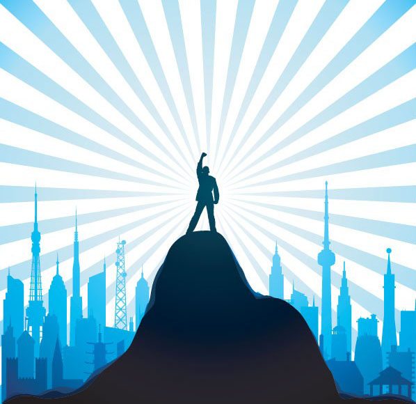 EPS格式,含JPG预览图,关键字:矢量人物,人物剪影,成功,顶峰,建筑剪影,高楼大厦,城市,放射线背景素材,矢量素材。