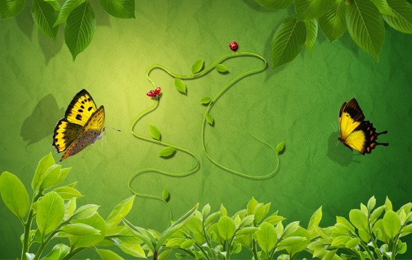 PSD格式,含JPG预览图,关键字:绿色花园,蝴蝶,植物,树叶