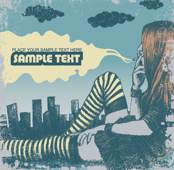 EPS格式,含JPG预览图,关键字:矢量人物,女孩,女性,潮流元素,插画,复古风格,吸烟,烟雾,云朵,建筑,矢量素材...