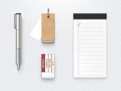 PSD格式,含JPG预览图,关键字:PSD,文具,图标,橡皮,muji,无印良品,便签本,圆珠笔,简洁
