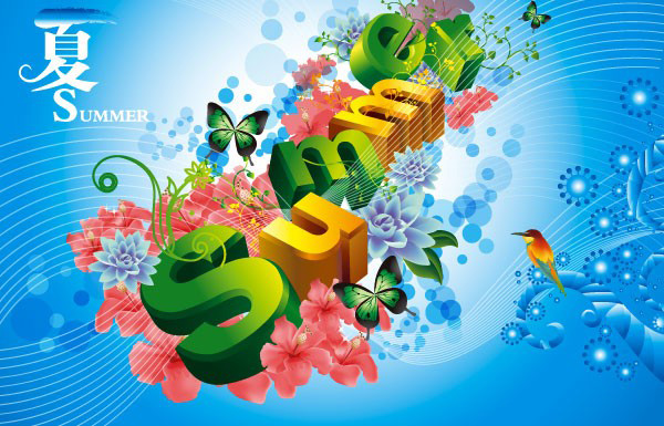 矢量夏天,生机勃勃,summer,艺术字,立体字,蝴蝶,花朵,小鸟,动感线条,花纹