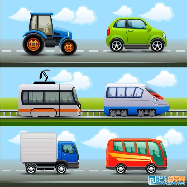 公交车和客车货车及私家车轿车矢量图,由软件自学网会员提供,免费下载,素材为EPS格式,请用illustrator软件打开。