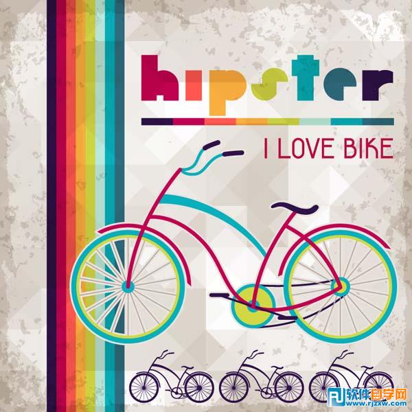 彩绘自行车条纹插画斑驳背景矢量图,由软件自学网会员提供,免费下载,素材为EPS格式,请用illustrator软件打开。