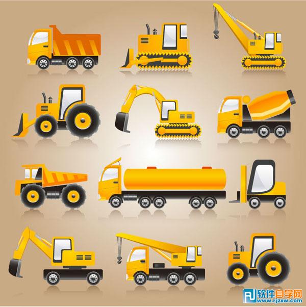 重型车推土机吊车铲土机等工程车矢量图,由软件自学网会员提供,免费下载,素材为EPS格式,请用illustrator软件打开。
