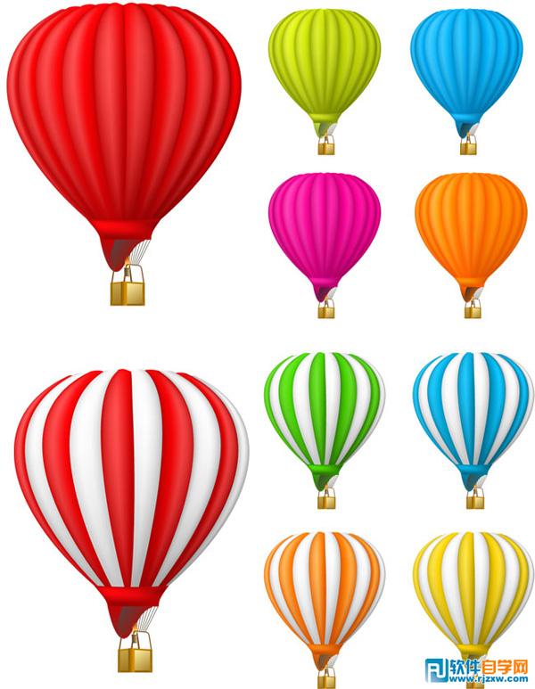 红色紫色橘色条纹的热气球矢量图,由软件自学网会员提供,免费下载,素材为EPS格式,请用illustrator软件打开。