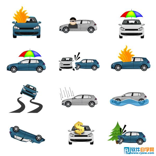 火灾盗窃等汽车保险矢量图,由软件自学网会员提供,免费下载,素材为EPS格式,请用illustrator软件打开。