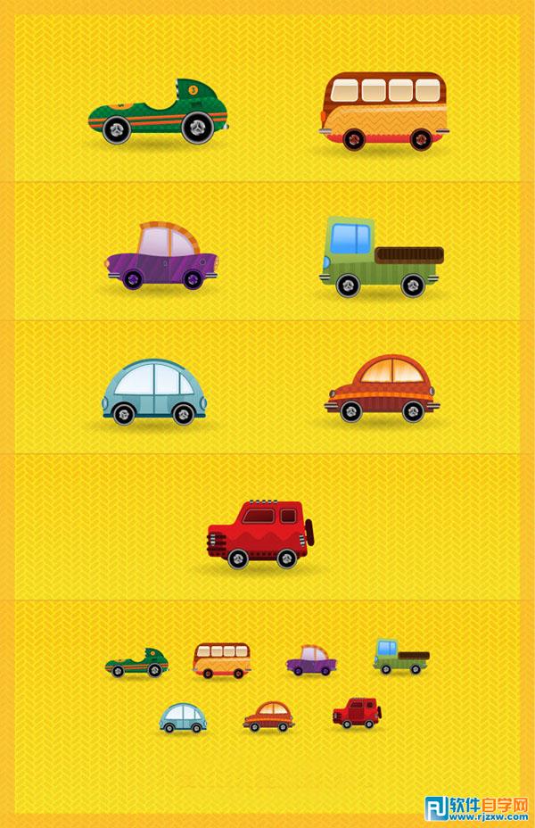 多种卡通迷你轿车交通工具矢量图(客车,火车,轿车,私家车,吉普车,货车,)由软件自学网会员提供,免费下载,素材为EPS格式,请用illustrator软件打开。