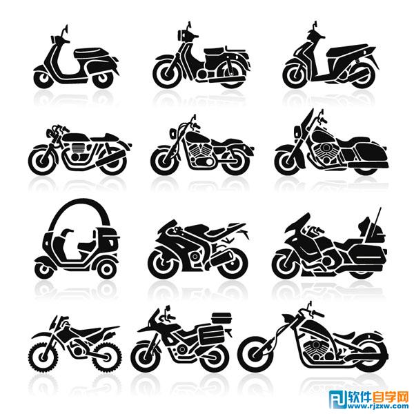 12款摩托车设计矢量图,(电动车,摩托车,交通工具,越野摩托车,哈雷车,矢量图)由软件自学网会员提供,免费下载,素材为EPS格式,请用illustrator软件打开。