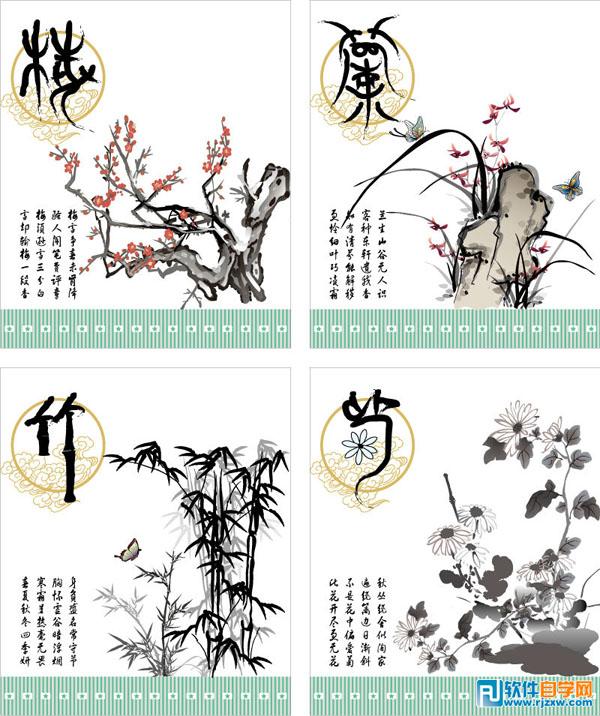梅兰竹菊插画矢量图(梅花,兰花,菊花,竹子,水墨画,插画,书法,蝴蝶,云朵,梅兰竹菊,国画)由软件自学网会员提供,免费下载,素材为EPS格式,请用illustrator软件打开。