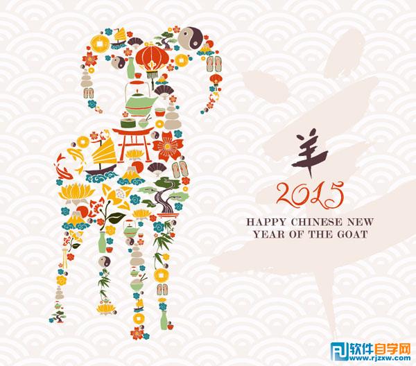 创意2015羊年背景图(羊年,2015年,山羊,大钱,帆船,灯笼,太极,拖鞋,盆栽,莲花,鱼,波浪纹,图标,矢量图)由软件自学网会员提供,免费下载,素材为EPS格式,请用illustrator软件打开。