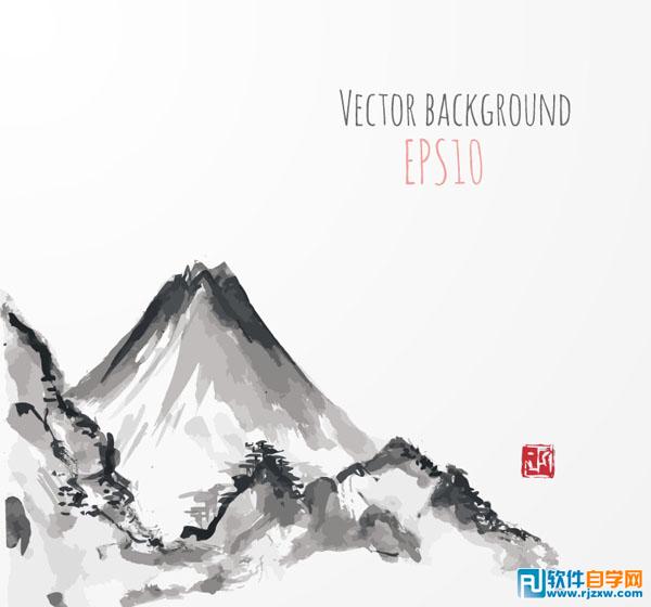 水墨山峦背景图(水墨画,山峦,背景,山水画,印章,矢量图)由软件自学网会员提供,免费下载,素材为EPS格式,请用illustrator软件打开。
