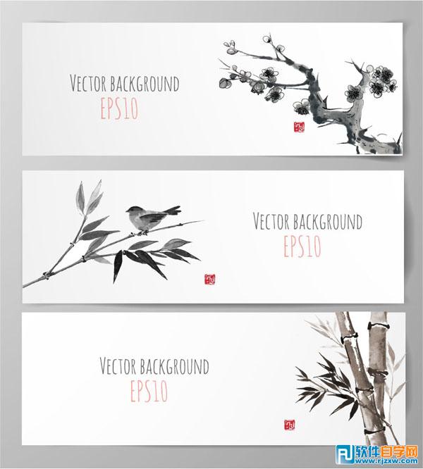 中国风,水墨画,竹子,鸟,梅花,印章,矢量图,由软件自学网会员提供,免费下载,素材为EPS格式,请用illustrator软件打开。