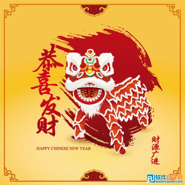 恭喜发财,舞狮,贺卡,节日,财源广进,春节,边框,矢量图,由软件自学网会员提供,免费下载,素材为EPS格式,请用illustrator软件打开。