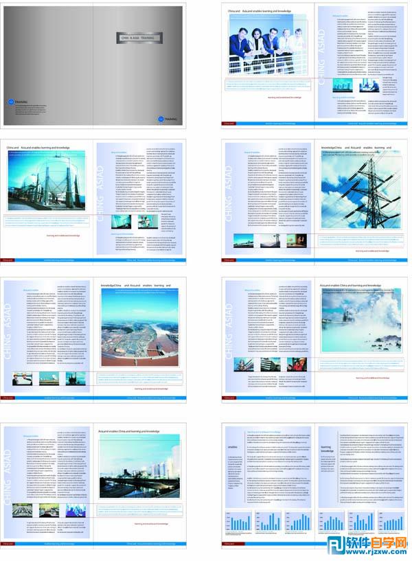 能源公司主题画册模板,以蓝色主题风格设计,共16页。由软件自学网会员提供,免费下载,素材为EPS格式,请用illustrator软件打开。