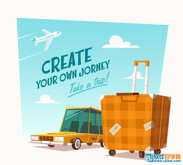 汽车,出租车,行李箱,旅行,云朵,插画,飞机,矢量图