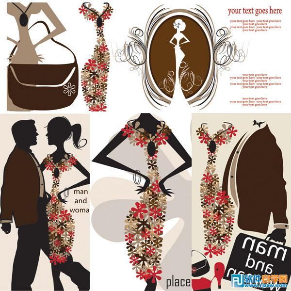 矢量潮流,人物,女性,轮廓,形体,剪影,时尚,花朵,手提包,高跟鞋,矢量图