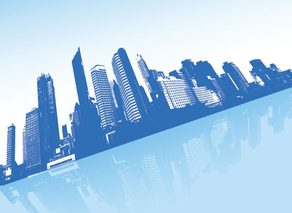 风景建筑矢量素材,矢量建筑,都市,城市,高楼大厦,蓝色,倒影