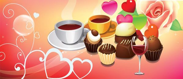 矢量,西式糕点,美味,咖啡,红酒,玫瑰花,心形,浪漫气氛,梦幻背景